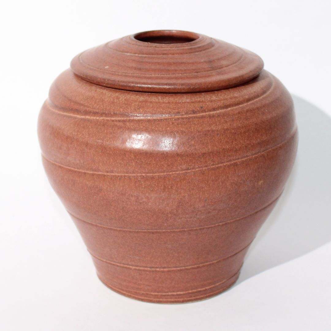 A speckled ceramic pottery jar with brown glazed stripes, seamlessly blending mid-century charm with artisanal...