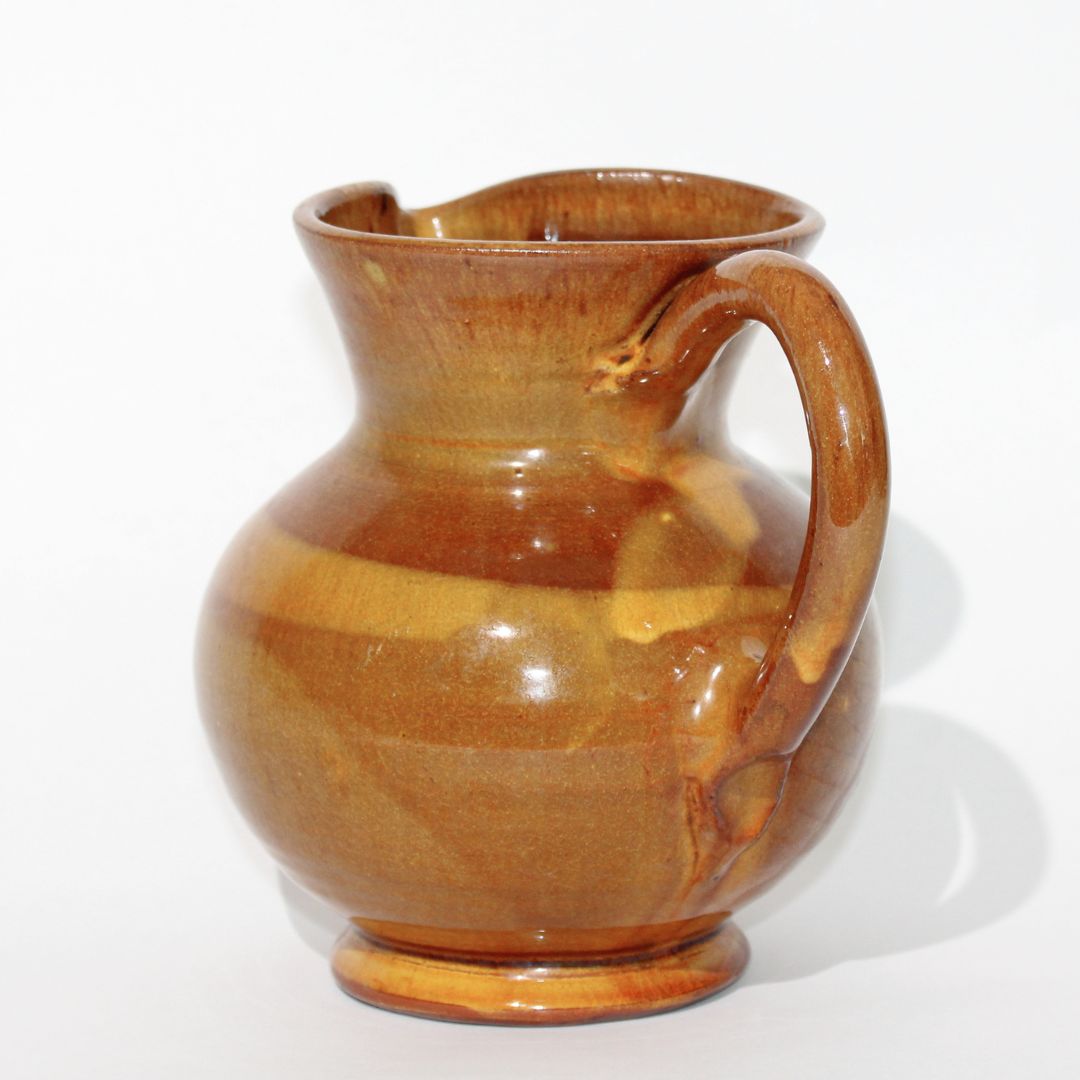 A sculptural ceramic pitcher in a bold, soothing yellow palette. Its distinctive handle and unique...