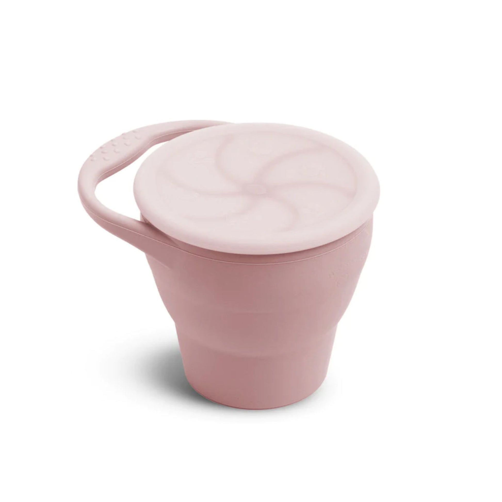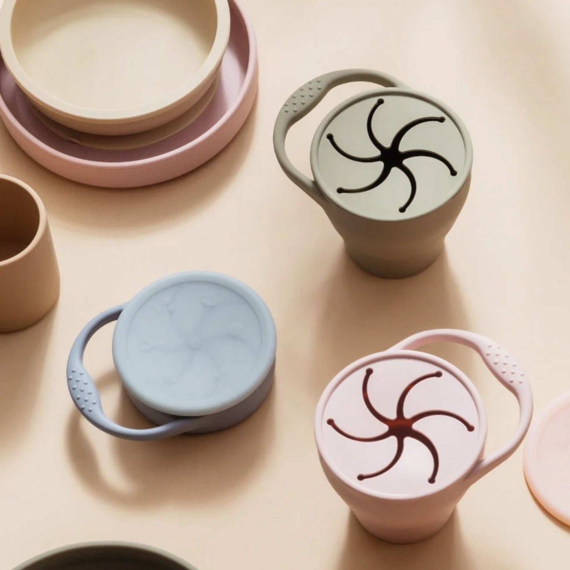 The Cam Snack Cup-Olive by Maison Rue is a durable, collapsible, and spill-proof snack cup made from 100% food-grade silicone, perfect for toddlers and preschoolers on the go.