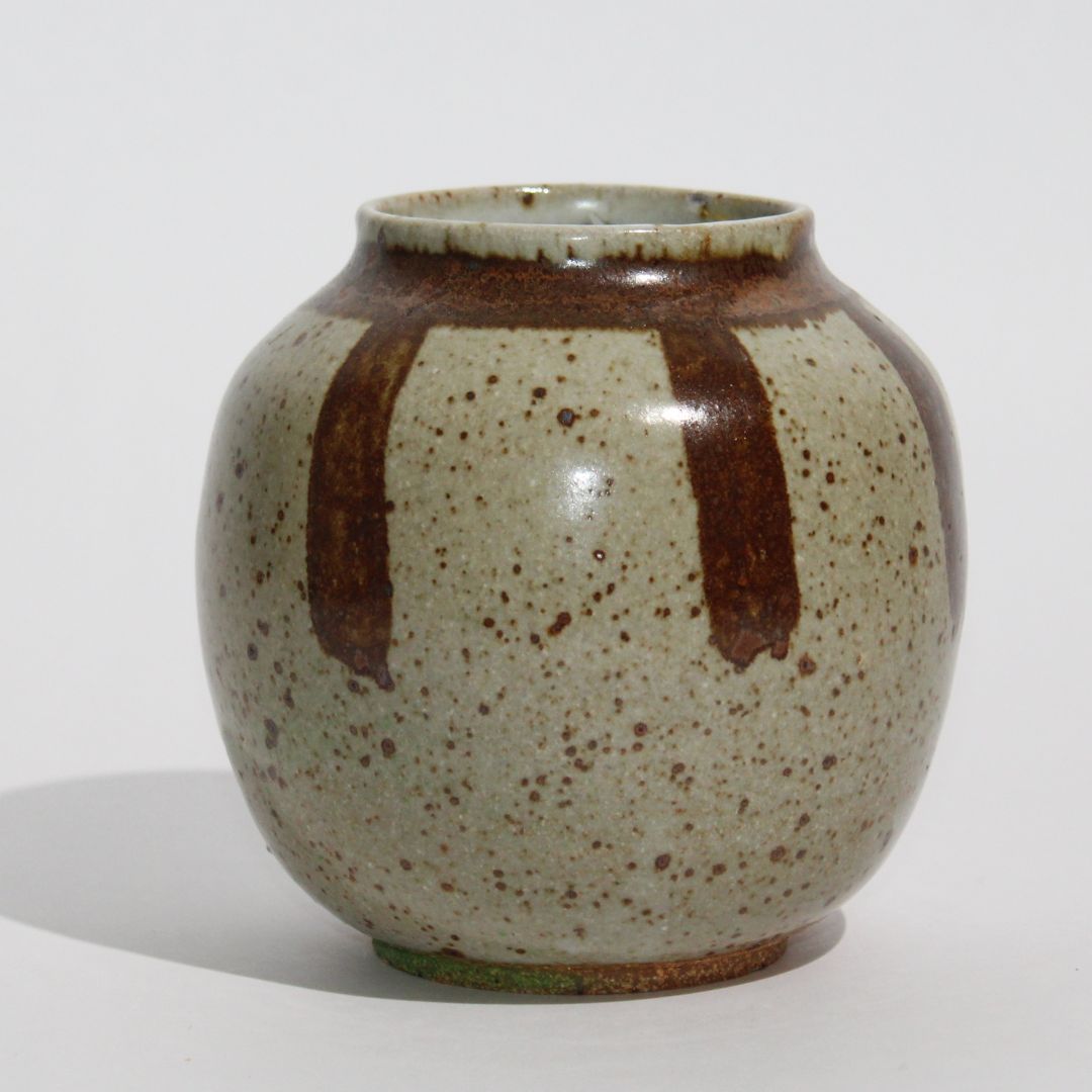 A speckled ceramic pottery jar with brown glazed stripes, seamlessly blending mid-century charm with artisanal design. A perfect centerpiece or accent to elevate any space.