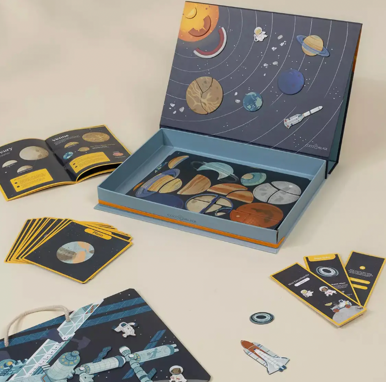 Discover the wonders of our solar system with this educational set packed with fascinating facts and vivid illustrations. Children can explore space through interactive magnetic puzzles and a mini encyclopedia filled with fun Q&A discoveries. Build your own International Space Station, learn about each planet’s unique features, and understand exactly where we are in the universe—all while sparking curiosity and imagination.