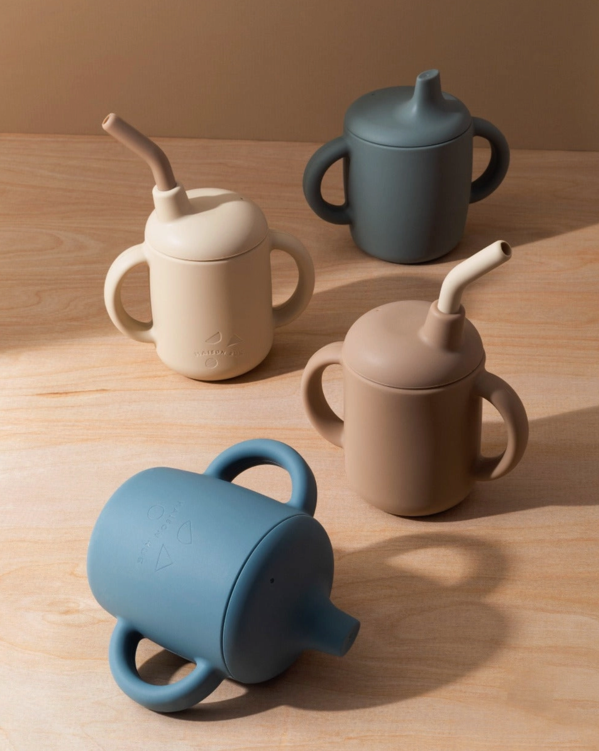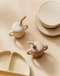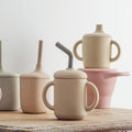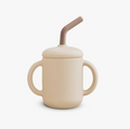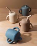 The Leo Cup, made from 100% food-grade silicone, is a versatile, leak-proof transition cup with double handles, a spout, ergonomic bent straw, and interior measurement markings, perfect for infants and toddlers learning to self-feed.