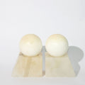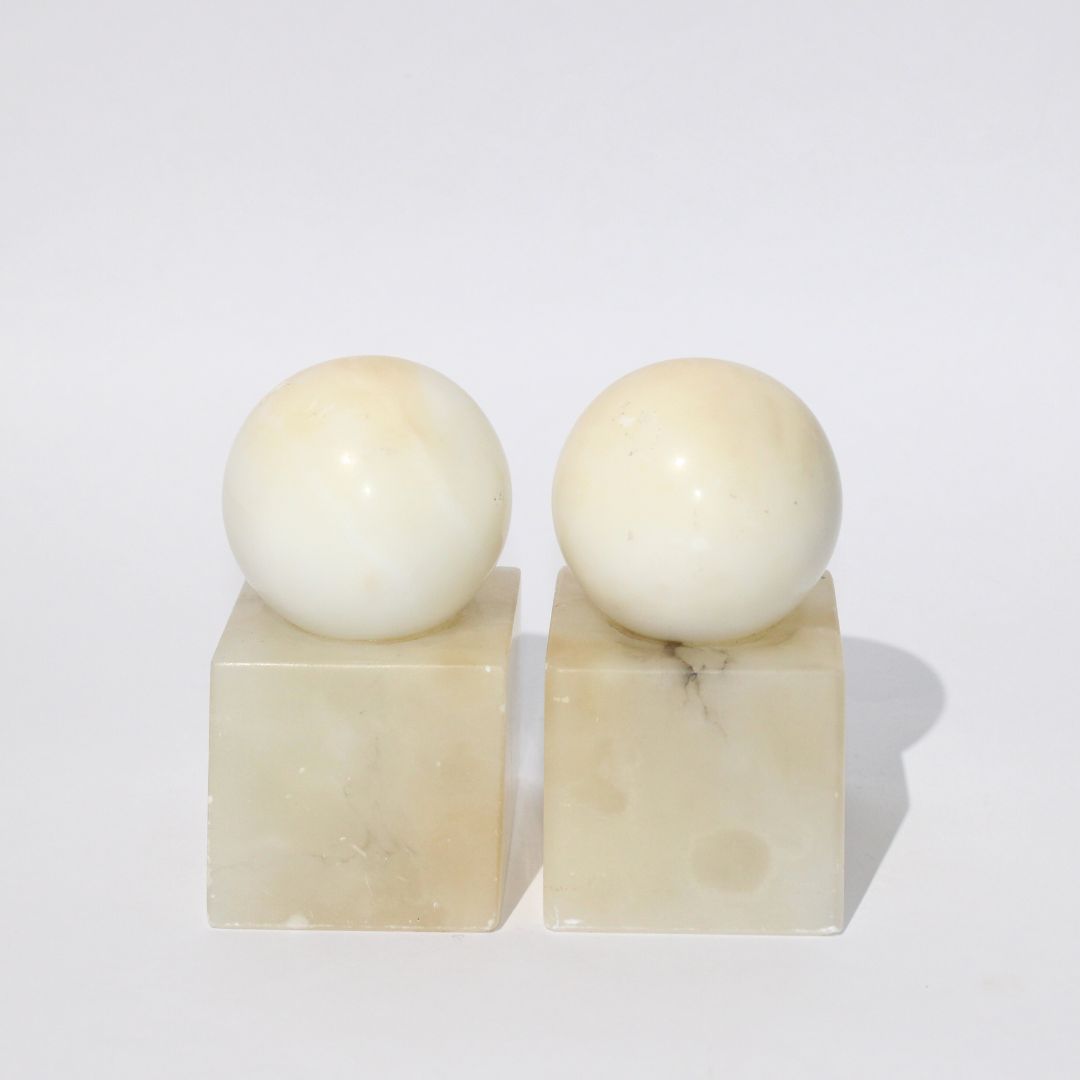 Vintage French marble bookends featuring sculptural spheres resting on solid geometric bases. Their creamy hue and natural veining add quiet sophistication, bringing balance and elegance to any shelf or workspace.