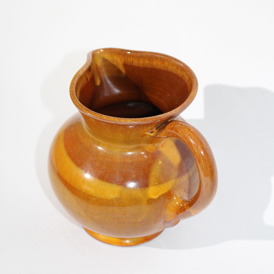 A sculptural ceramic pitcher in a bold, soothing yellow palette. Its distinctive handle and unique form make it equally striking as a display piece or a functional vessel for your favorite beverages. Sourced from Provence, France.