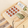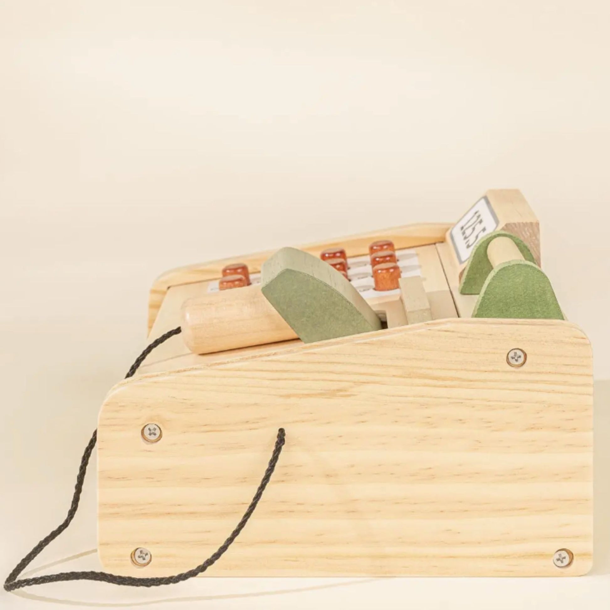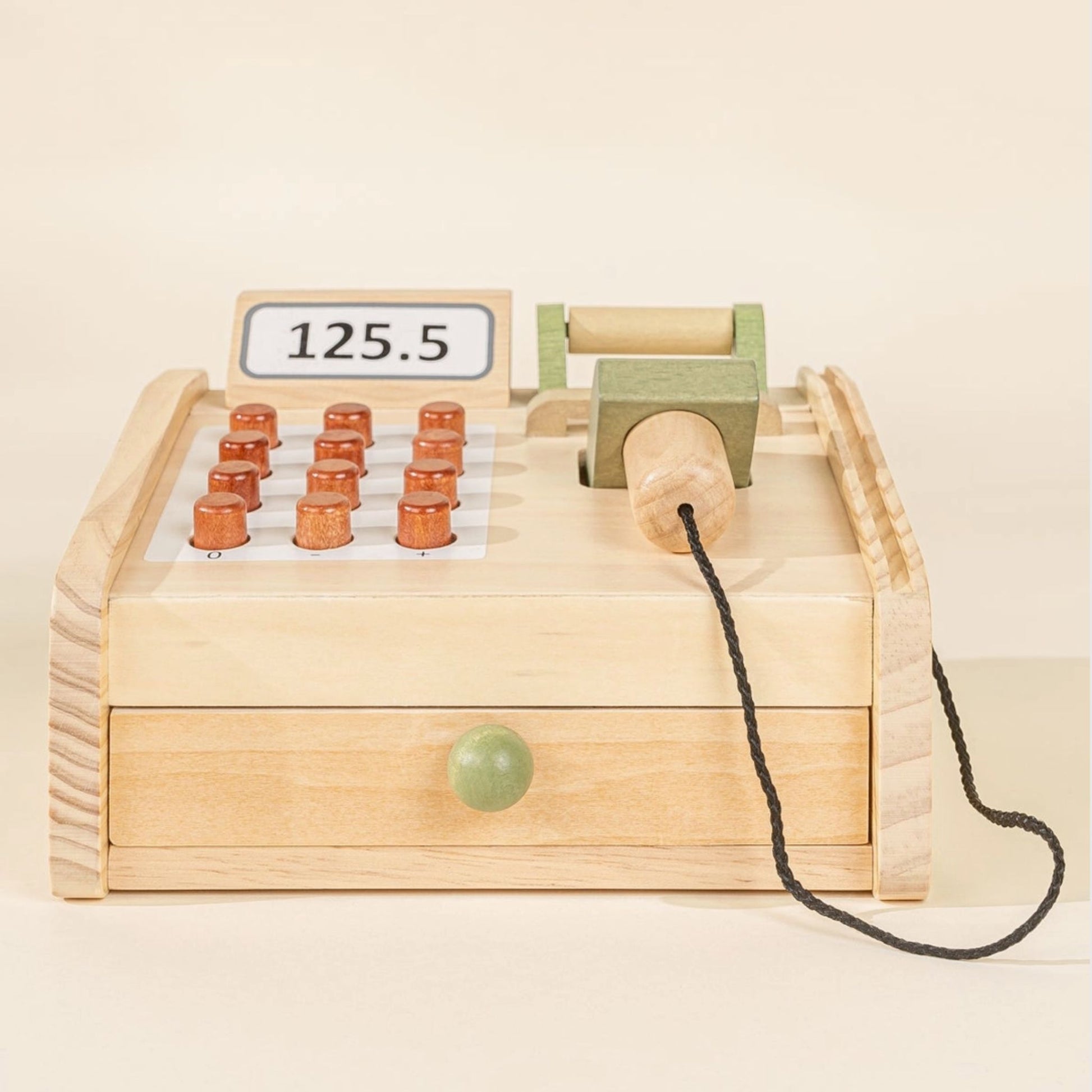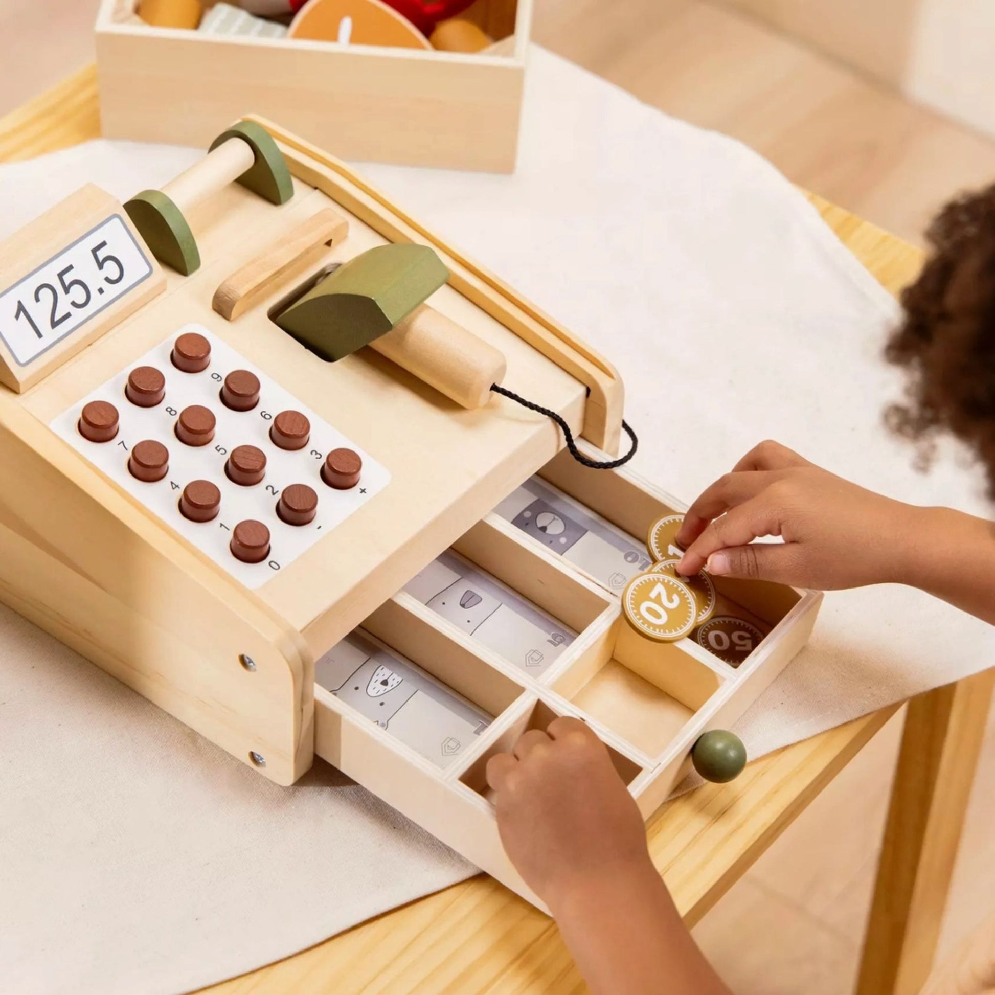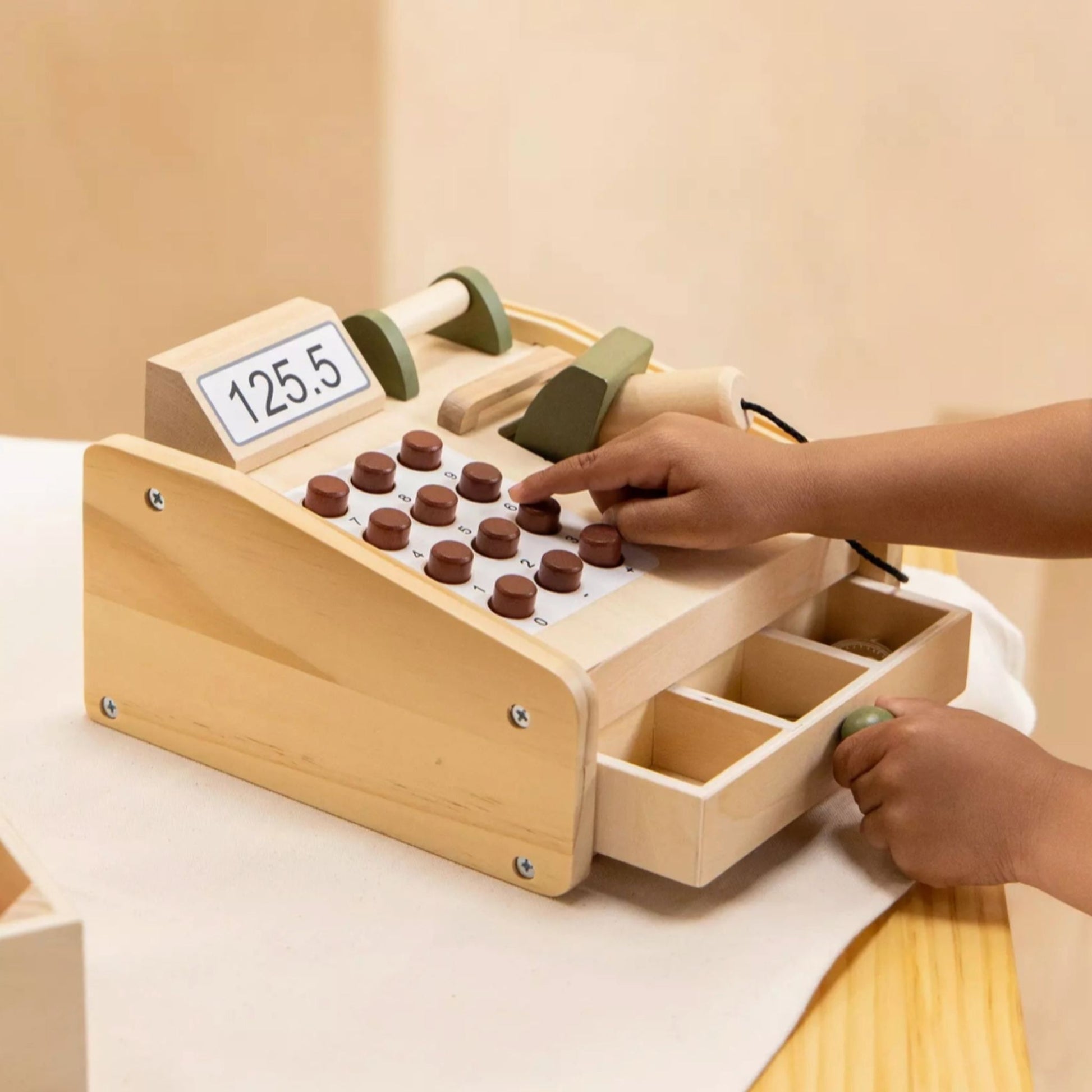 Toddlers love to have fun shopping! From selecting food items to put in the cart to checking out, there is so much to do, discover and learn! The Wooden Cash Register is a perfect item to add to the playroom! It's a fun way to introduce your child to simple math, teaching them to count through play!